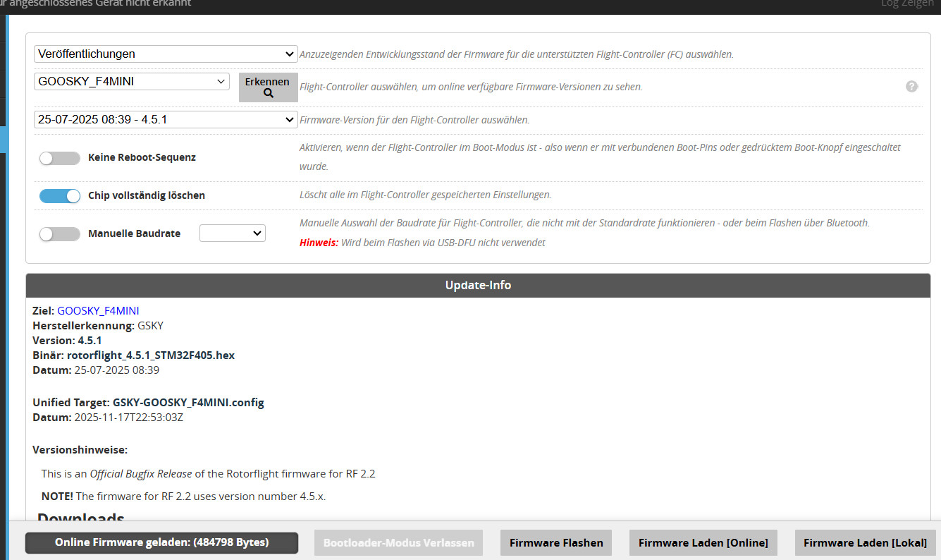 Bevor ich jedoch den Schraubendreher in die Hand nehme, gehe ich auf Nummer sicher. Obwohl das Board mit Rotorflight 4.5.0 ausgeliefert wird und sofort einsatzbereit wäre, ist es besser, es vor der Installation auf die aktuell stabilste Version 4.5.1 upzudaten. Die Rotorflight-Konfiguration ist werkseitig perfekt auf den S2 MAX abgestimmt; daher ist der erste und wichtigste Schritt die Sicherung dieser Einstellungen.