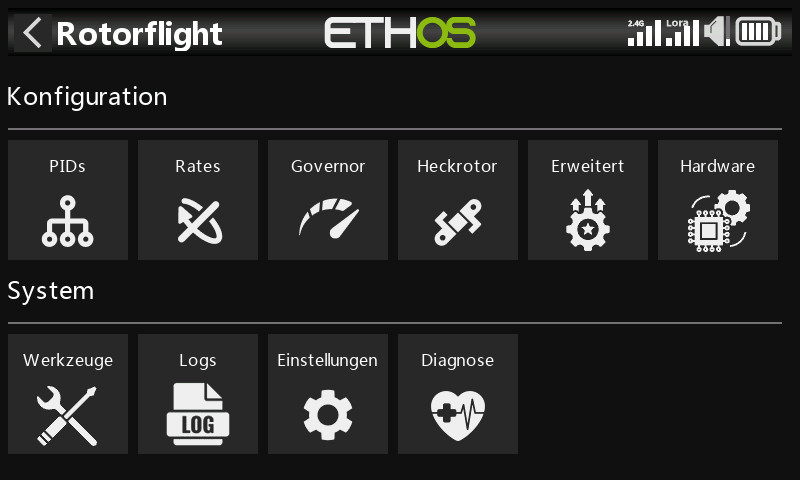 Softwareseitig wird das Vantec mit der vorinstallierten Rotorflight-Version 2.1 ausgeliefert. Da die Entwicklung bei Open-Source-Projekten jedoch rasant voranschreitet und die Community stetig Verbesserungen liefert, sollte man bei der Inbetriebnahme gleich die aktuelle Version auf dem System installieren. Die Aktualisierung auf die zum Testzeitpunkt aktuelle Version 2.2 erwies sich nach dem Anschluss an den PC als völlig unproblematisch und war binnen weniger Augenblicke erledigt. Der wohl größte Trumpf, den FrSky hier ausspielt, ist jedoch die nahtlose Einbindung in das eigene Ökosystem: Dank der Integration in die Ethos Suite lässt sich das Vantec bequem über eine Lua-Anwendung direkt im Sender konfigurieren. Damit wird der Sender zur vollwertigen Programmierbox, und Anpassungen auf dem Flugfeld lassen sich schnell und intuitiv erledigen, ohne dass zwingend ein Laptop ausgepackt werden muss.