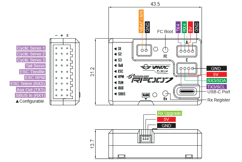 Ein Blick auf die Oberseite der Einheit zeigt ein aufgeräumtes Layout mit zwei versenkt angebrachten Tastern, die vor versehentlicher Betätigung geschützt sind: Einer dient dem Reset der FBL-Einheit, der andere zum Binden des internen Empfängers. Außerdem befindet sich dort der USB-C-Anschluss für die Konfiguration via Rotorflight sowie zwei UART-Schnittstellen (JST-GH) für Erweiterungen. Besonders wertvoll für die Telemetrie ist der dedizierte JST-GH Port zur externen Spannungsmessung, der Spannungen von 0 bis 80,0 Volt verarbeiten kann und somit eine direkte Überwachung des Flugakkus ermöglicht. Sollte es einmal Probleme mit den komfortablen Over-the-Air-Updates (OTA) geben, findet sich an der Gehäuseseite zudem ein physischer RxUG-Port als zuverlässige Backup-Lösung zum Flashen der Firmware.